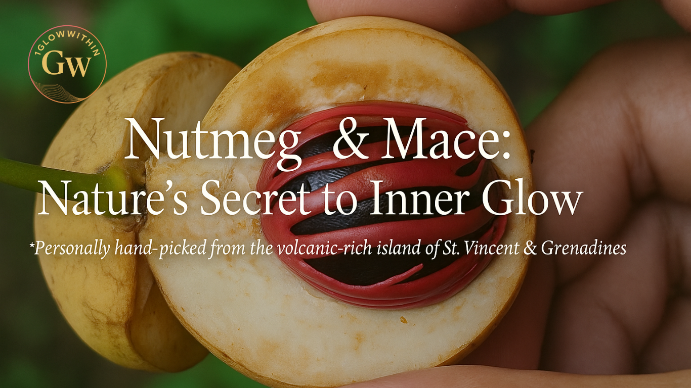 The 1GlowWithin Way: At 1GlowWithin, every ingredient tells a story of balance, beauty, and connection to nature. This nutmeg, hand-picked from the volcanic heart of St. Vincent & the Grenadines, reminds us that inner health truly radiates outward. From the soil to your senses your glow begins within.